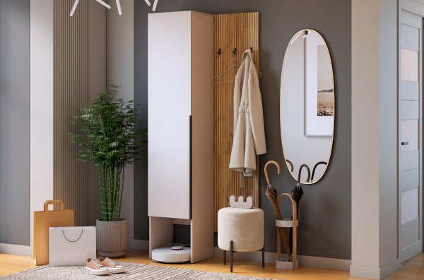 Принт, имитирующий вертикальную фрезеровку придает вешалке уникальный и современный вид, добавляя текстуру и глубину. Материал вешалки – ЛДСП, что обеспечивает прочность и долговечность, а также легкость в уходе.
